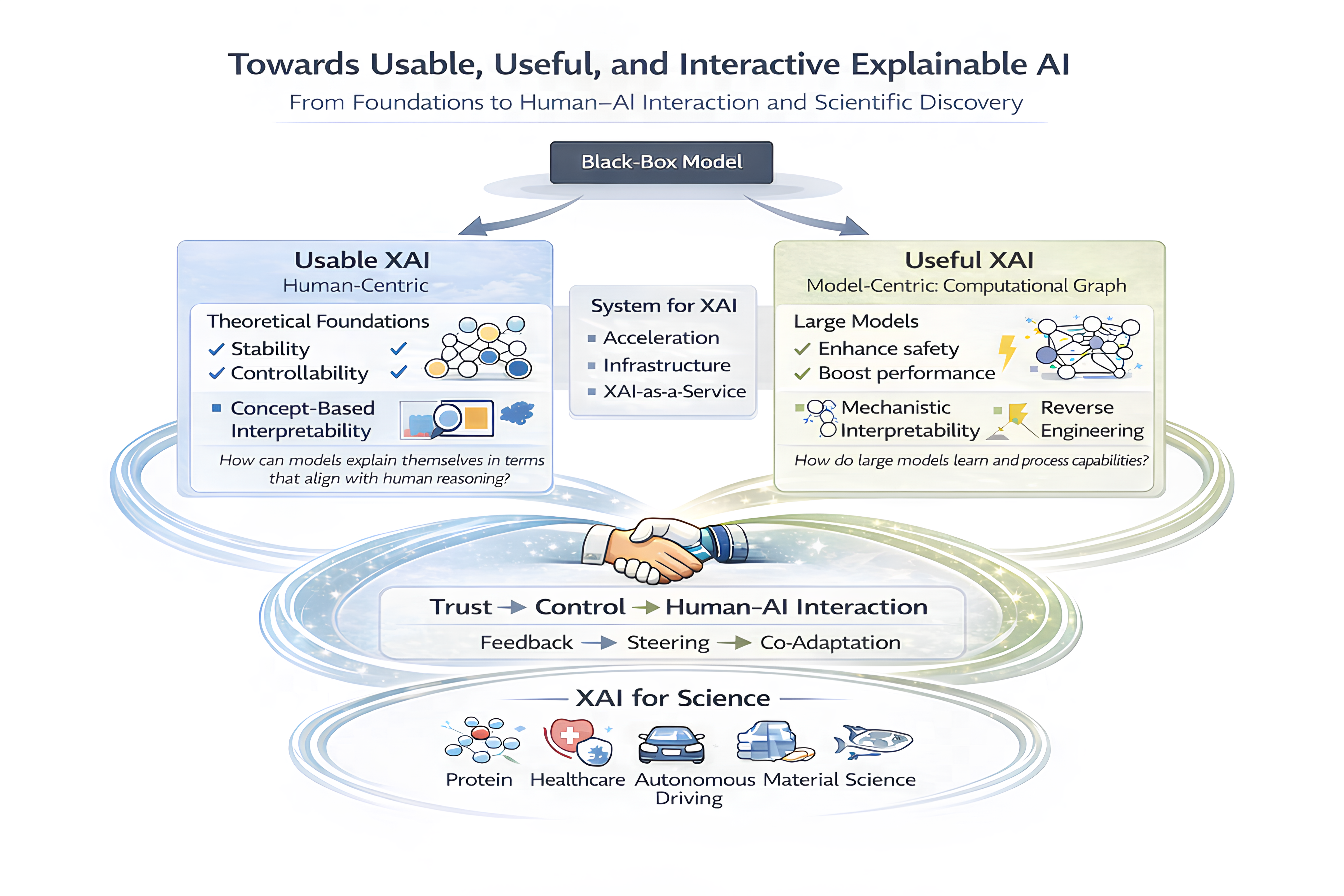 Here, Usable XAI refers to human-centric explanation services that support model understanding with strong faithfulness and practical utility. The central question is: “How can models explain themselves in terms that people can actually understand and use?” Useful XAI focuses on model-centric interpretability, where explanation toolkits reveal the model’s underlying computational graph and provide actionable insights for improving performance and trustworthiness. This line of work asks: “What computation is actually implemented inside large models?” Building on Usable XAI and Useful XAI, my research further explores Interactive XAI, which treats explanations as interfaces for human–AI interaction. By grounding human-centric explanations in model-centric computational understanding, Interactive XAI enables a progression from trust, to control, and ultimately to sustained human–AI interaction. My research helps realize these goals by making progress in the following five directions: